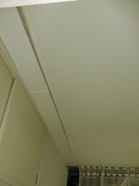 天井(寝室)−我が家の寝室ですが、天井の壁紙がはがれてきたため 写真左側の幅20センチぐらいを、自分で貼ったのですが(新しいので色が白い)、 3年ぐらい経ったでしょうか、元の壁紙の部分がだんだんはがれてきてしまいました。