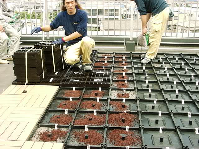 保水材を入れたパレットの上に、載せる土の排水用グリッドをかぶせていきます。
